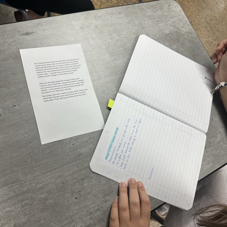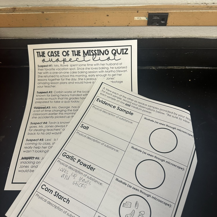 Today in forensics we solved the case of the missing quiz. Students looked at substances under the microscope and took notes. They compared that to the substance left over at the crime scene and to the suspect list. Turns out Lexi was the one responsible! Great job, detectives!