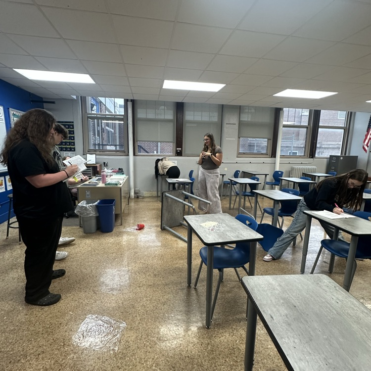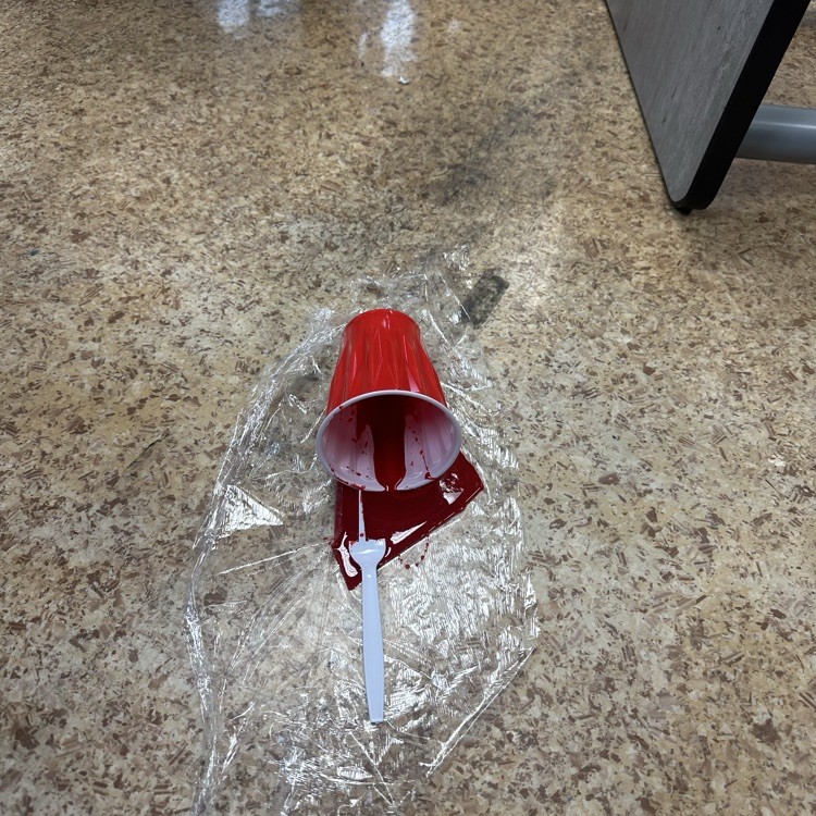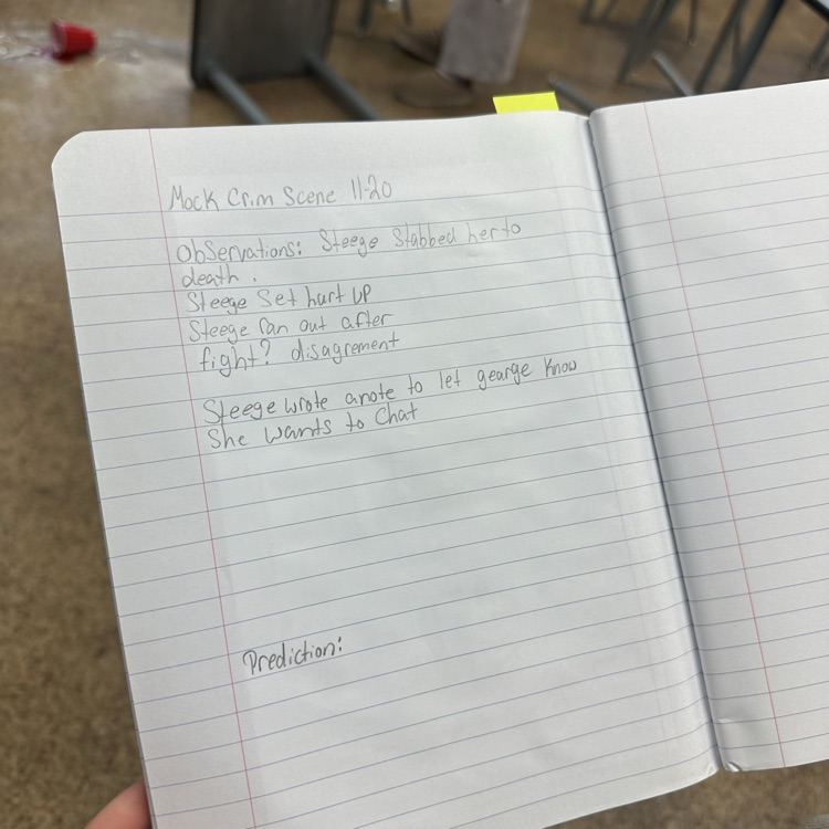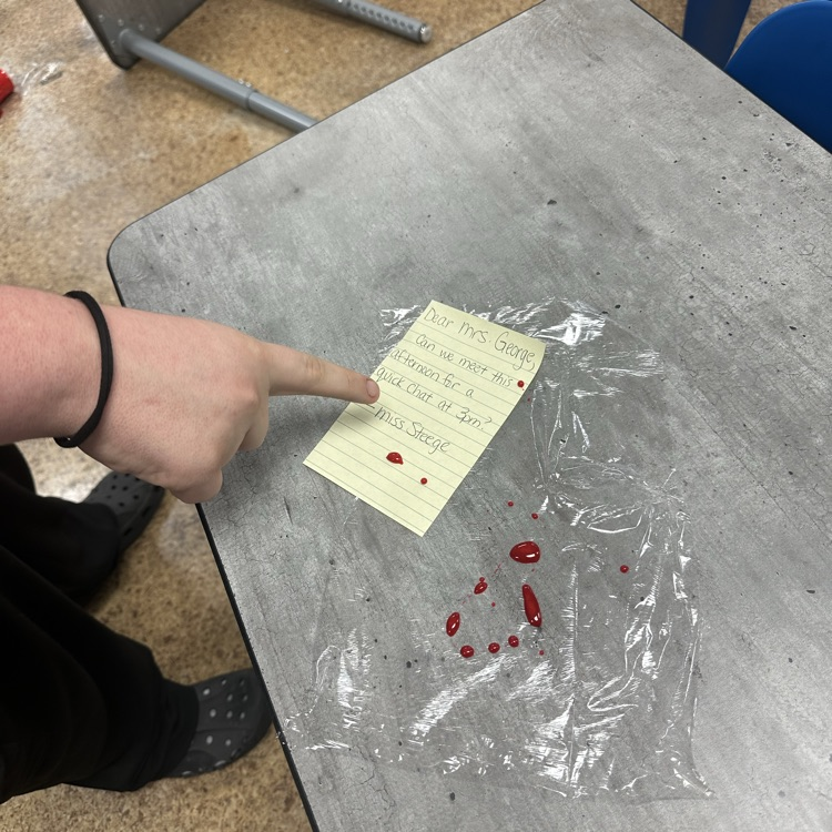 Forensic detectives practiced their observation skills with a mock crime scene. We observed some blood spatter, footprints, a note, and an overturned desk. Lots of good predictions. The conclusion: a nosebleed during a staff meeting! *not real blood*